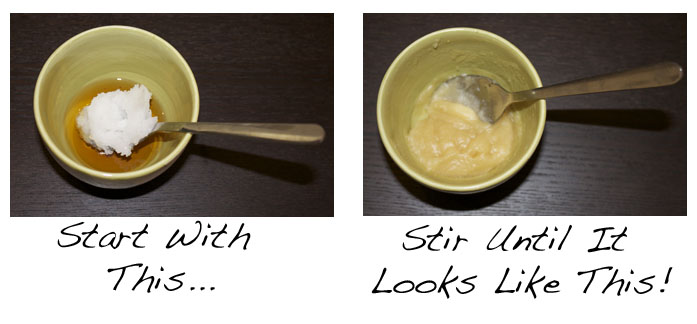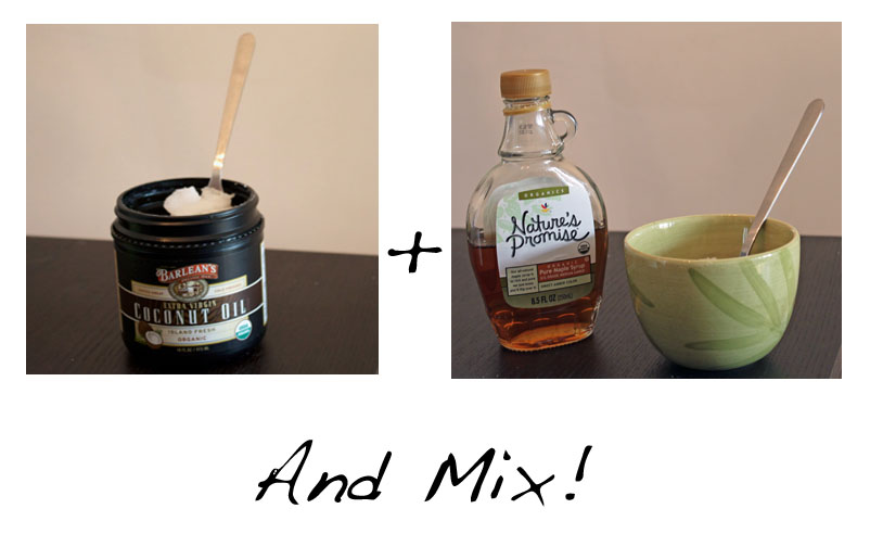 Mix equal parts Virgin Unrefined Coconut Oil and Maple Syrup. Both items I used in my example are USDA organic, but you don’t need to go out of your way to get organic items, this just happens to be what I had on hand. However, you do need to get real maple syrup, not maple “FLAVORED” syrup like Aunt Jemima or Mrs. Butterworth. If the bottle is shaped like an old time-y fat lady you most likely have the wrong thing.