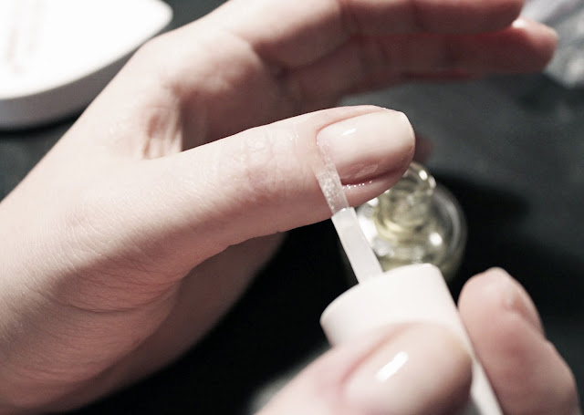 Once you have washed them to get the excess oil off, it’s time to apply a strengthening base coat. This will increase the curve in the nail bed which makes them harder to break, as well as add a coat of protection.
