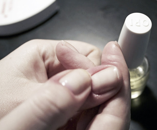 When you have massaged the oil into your nails, you can let it sit for a while and really get in there. But since I know aint nobody got time for that, you can also wash them in warm water with some gentle hand soap and move on to the next step.