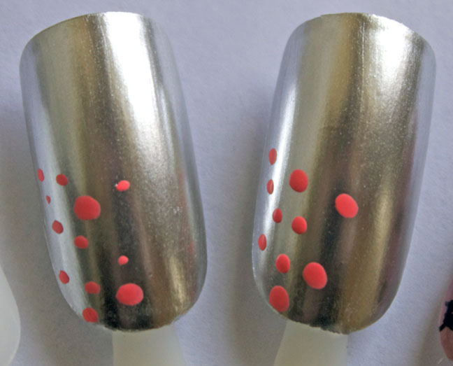 This first one is SUPER easy, but I think the color and texture combination is really cool. I did two coats of the chrome color, which is OPI “Push and Shove” and then dotted on some JulieG Nail Polish in Bikini with a nail art brush. I really should buy a dotting tool, I don’t know why I haven’t already.
